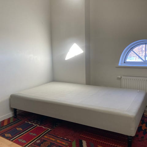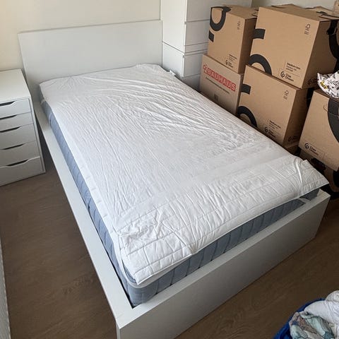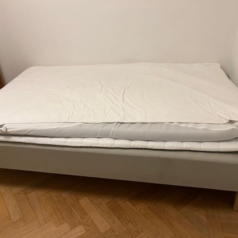 Sängstomme från IKEA. 120x200. Finns några små märken men annars i fint skick. Sängstomme och ribbotten ingår.