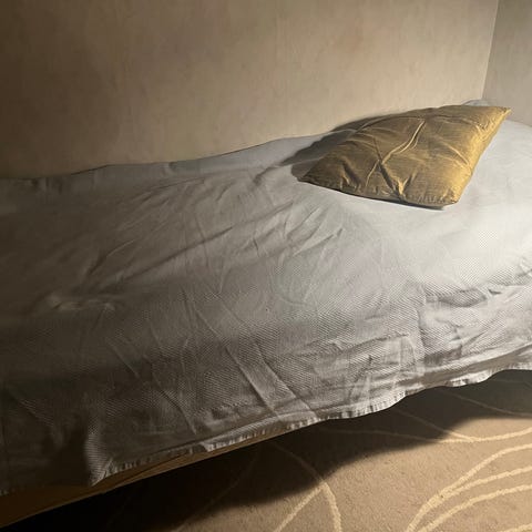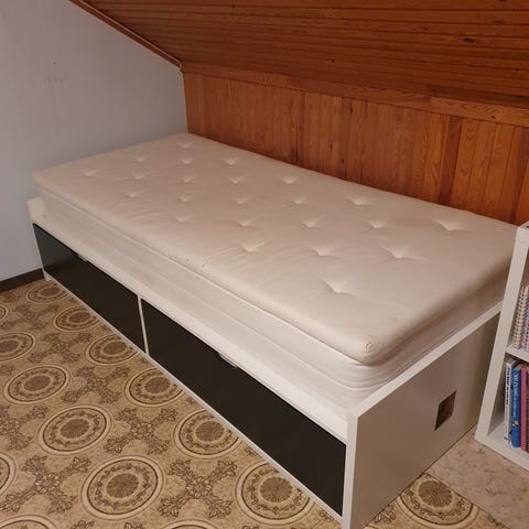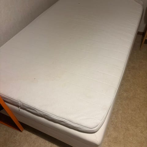 SKÄNKES: Resårbotten 105x210, 10 år gammal men helt ok. En söm på ca 10 cm har gått upp, se foto. Katt- och hundhår medföljer garanterat😄