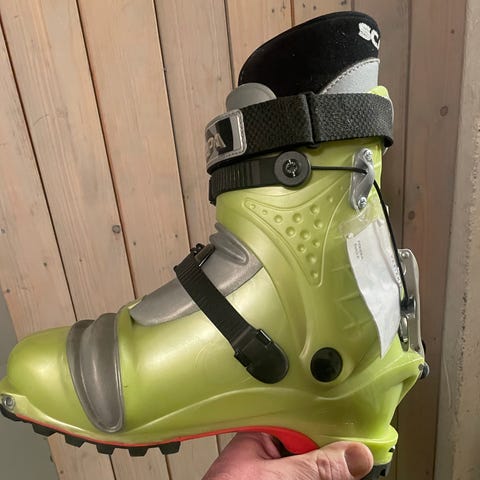 Scarpa telemarkspjäxor med 2 spännen. Lätt att ta ur innerskon. Storlek 5, motsvarar ungefär storlek 38. Innersulans längd ca 24,5 cm. Svart blå i färgen. Finns på Södermalm.