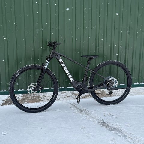 Trek el-mountainbike i svart utförande. Cykeln har dämpad framgaffel och bakdämpare, skivbromsar och grovmönstrade däck anpassade för terrängkörning. Elmotorn är integrerad i ramen med batteri monterat på nedre ramröret.