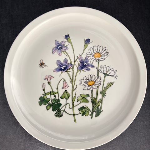 Rörstrand Kurbits tallrik med blomstermotiv. Tallriken är rund och har ett tryckt flerfärgat blommönster i vas på vit botten. Undersidan är märkt med serienamnet Kurbits och Rörstrands logotyp. Passar för servering av exempelvis varmrätter, sallader eller som uppläggningsfat i kök och matsal.