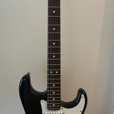 Elgitarr i stratocaster‑stil med svart kropp och vit plektrumskydd. Gitarren har tre single‑coil‑mikrofoner, femlägesomkopplare, volym- och tonkontroller samt tremolostall. Hals och greppbräda är i ljust trä med 21 band och punktmarkeringar. Passar för elgitarrspel inom olika musikstilar och kan användas med standardförstärkare och effektpedaler.