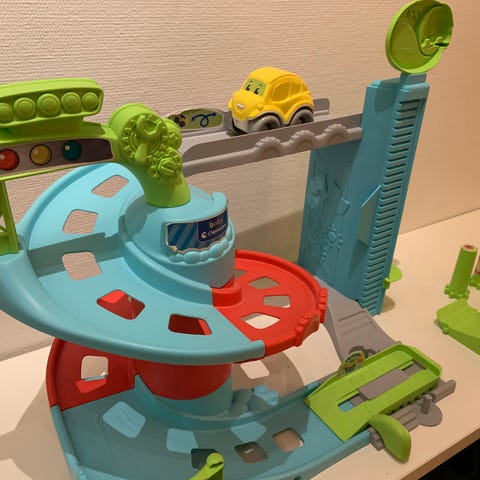 Fisher-Price leksaksparkering garage med bil i plast. Flerplansgarage med ramp, hiss och parkeringsyta samt en liten leksaksbil. Färgglad konstruktion med blå, gula, röda och vita delar anpassad för barnlek med bilar och fordon inomhus.