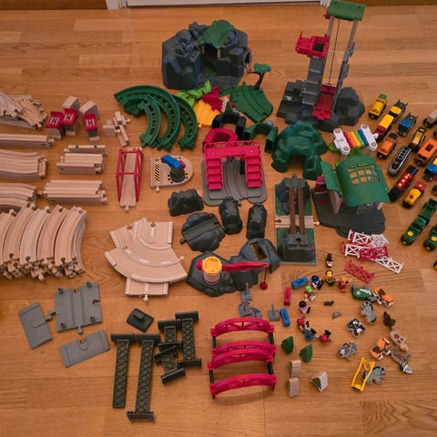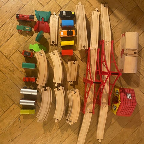 BRIO trätågbana med tillbehör. Innehåller blandade delar som räls, broar, byggnader och fordon i trä och plast, enligt bilder. Passar för barn som vill bygga och leka med ett tåglandskap på golv eller bord. Exakt antal delar och specifika set framgår inte, utan säljs som en blandad samling BRIO-delar.