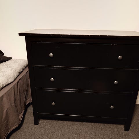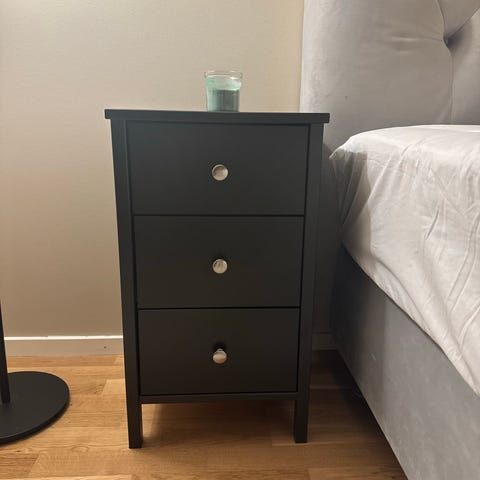2 st tuffa sängbord med lådor. Svart med metallringar. En ring saknas därför billigt pris.