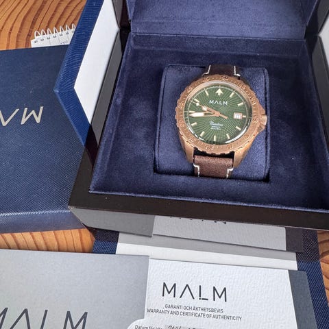Säljer min Swedish Peaceekerklocka från den svenska klocktillverkaren Malm, då den inte får den kärleken den förtjänar - tyvärr lite för stor för min handled. Jag har använt klockan vid ungefär 10 tillfällen, så skicket är så gott som nytt med enbart mindre synbara slitage som fina hairlines på länken.