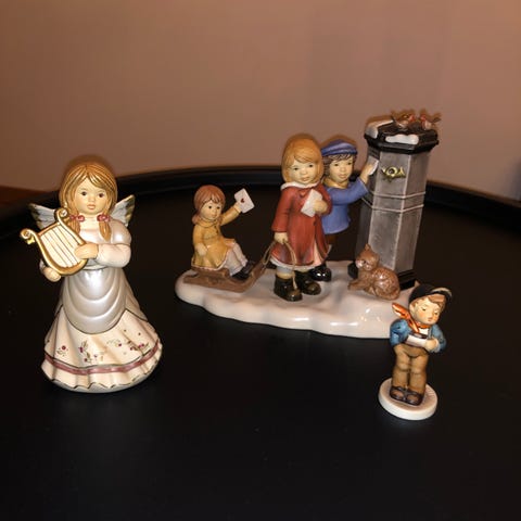 Porslinsfigurer med barnmotiv i blandade färger. Samlingen består av flera fristående figurer i olika poser, stående och liggande, placerade på runda socklar. Passar som prydnad i hylla, vitrinskåp eller liknande inredning. Materialet framstår som glaserad keramik eller porslin med målade detaljer.