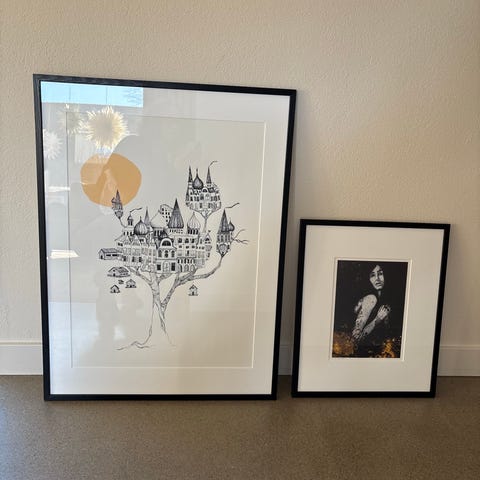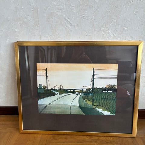 Inramade konstverk med olika motiv, bland annat landskap och abstrakta kompositioner. Flera verk har informationsblad på baksidan om konstnärerna och tekniken, till exempel temperamålning. Tavlorna är monterade i ram med passepartout och är avsedda som väggkonst för inomhusbruk. Färgerna domineras av blå, gröna och jordnära toner samt pastellfärger i vissa motiv.