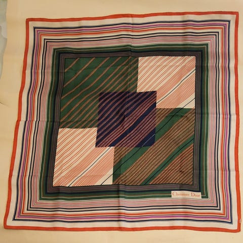 Christian Dior scarf för kvinna i rosa nyans med mönstrat tryck och logotyptext. Scarfen är smal och lång, lämplig att bära runt halsen, i håret eller som accessoar på väska. Levereras i ask från Christian Dior enligt bild.
