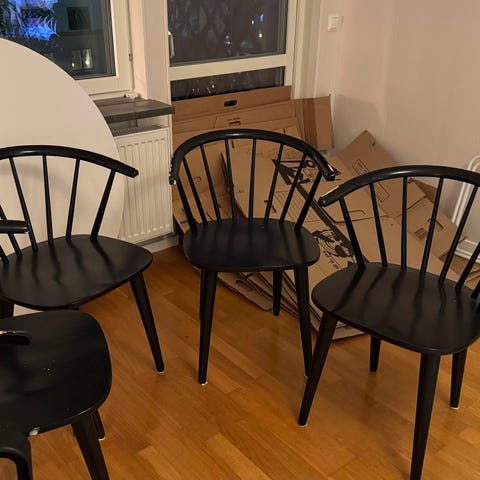 Säljer 6 st svarta matstolar från Sleepo, modell Willy. Snygga, stilrena och bekväma att sitta i. Måste tyvärr sälja dem då de inte passade i matrummet. Fint skick, endast lättare slitage enligt bilder. De flätade sitsarna är i mycket bra skick.