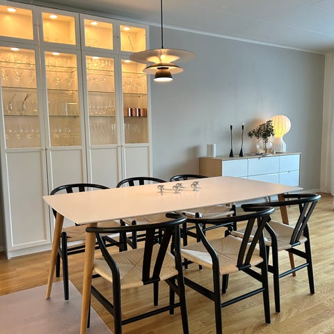 Stolarna är köpt av Tibergs Möbler, Mood matstol från Torkelson. Stolen är helklädd i mörkgrått ulltyg och har ben i massiv oljas ek.