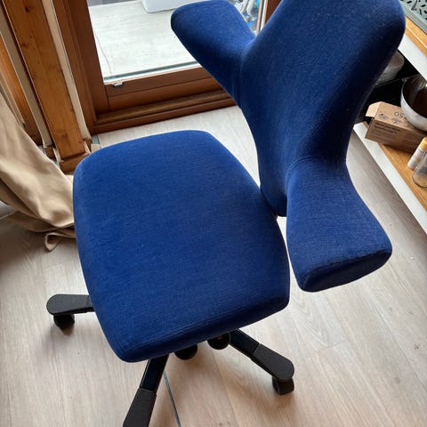 Fullt fungerande kontorsstol, med ergonomisk kontorsstol med sadelsits. Höj- och sänkbar vinkelbar och så vidare. Behöver omklädnad på grund av slitage, annars allt okej.