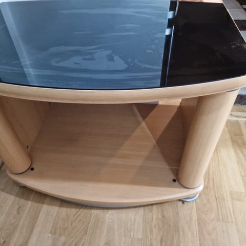 TV‑bänk på hjul med glasdörrar i rödbrun träfinish. Bänken har en vridbar skiva för placering av TV eller annan elektronik. Under skivan finns ett förvaringsutrymme bakom två tonade glasdörrar. Möbeln står på hjul vilket underlättar förflyttning och kabeldragning. Passar för förvaring av mediautrustning, spelkonsoler eller annan elektronik i vardagsrum eller tv‑rum.