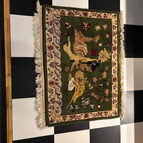 Amir matta med orientalinspirerat mönster. Mattan en röd bottenfärg med mönster i bland annat mörkblått, vitt och beige samt bård runt kanterna. Kortsidorna har fransar. Passar exempelvis i vardagsrum, sovrum eller hall. Material och exakta mått framgår av etiketten på baksidan om det behövs kontrolleras närmare.Ullmatta