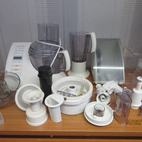 Bosch köksmaskin med flera tillbehör. På bilderna syns bland annat blandarskål, mixerbehållare, visptillbehör, köttkvarnsdelar, riv- och skärskivor samt olika plast- och metalldelar för matberedning. Köksmaskinen är avsedd för användning i hushållskök för blandning, vispning, malning och rivning av olika livsmedel.