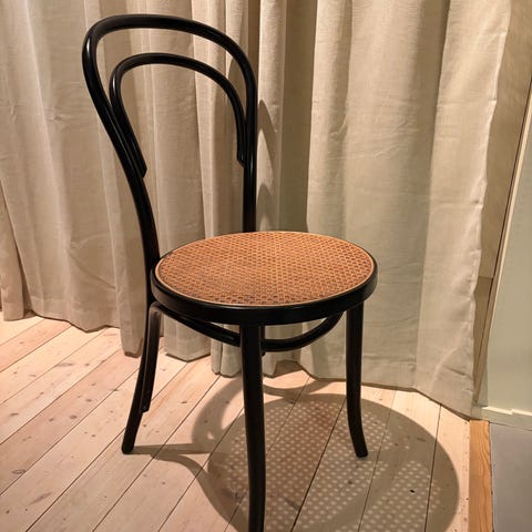 No. 14 stol från TON med en tidlös design i svart färg och med rottingsits. Stolarna är i bra skick och knappt använda, utan stått vid ett bord vi inte ätit vid till vardags. Stolarna har inga synbara märken eller hack.