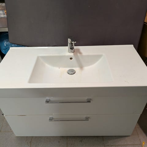 Badrumskommod med tvättställ vit oval och blandare