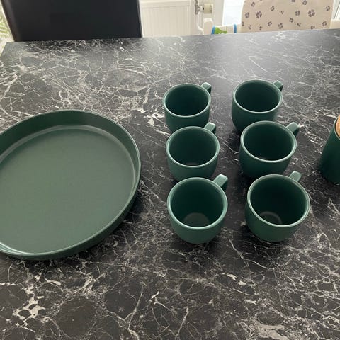 Höganäsmuggar i keramik i flera färger. Setet består av fem muggar i olika nyanser av grönt och blått. Passar för servering av kaffe, te eller andra varma drycker i kök eller på kontor. Klassisk form med handtag som ger ett stadigt grepp. Kan användas både till vardags och vid enklare dukningar.