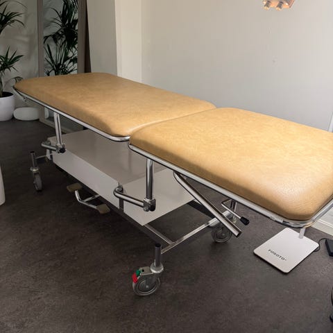 Beige behandlingsbänk på hjul med ställbar höjd. Bänken har tvådelad liggyta med vadderad klädsel och metallstomme. Utrustad med låsbara hjul för enkel förflyttning och stabil placering. Passar för exempelvis massage, undersökningar eller annan behandlingsverksamhet i klinik, salong eller liknande miljöer.