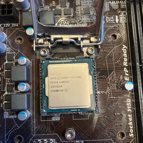 Processor CPU för stationär dator. Standard desktop-processor med kontaktfält på undersidan och metallkapsel på ovansidan. Lämplig som reservdel eller utbyte i kompatibelt moderkort. Exakt modell, sockeltyp, klockfrekvens och övriga tekniska specifikationer är inte angivna och behöver kontrolleras mot befintligt system innan användning.