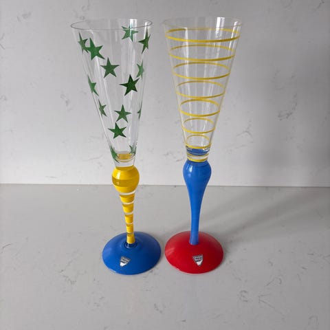 Orrefors champagneglas Clown. Fyra glas i olika färger och dekorer. Ett av glasen har ett minimalt jack och säljes för halva priset (500) Resterande tre glas är som nya och knappt använda.