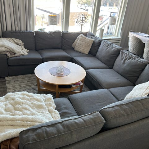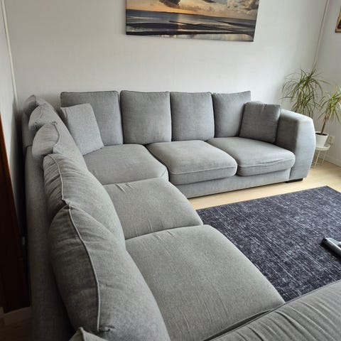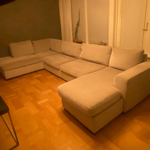 Stor U soffa säljes pga av flytt. Alla dynor är löstagbara och möjliga att tvätta. Liten hund finns i hemmet.