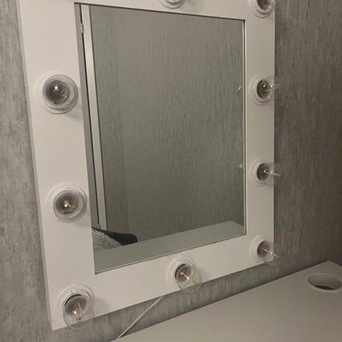 Rusta sminkspegel med belysning i vit färg. Spegeln har inbyggda lampor runt ovankant och sidor som ger jämn belysning vid sminkning eller styling. Den står på en stabil fot och ansluts med medföljande sladd till eluttag. Passar att placera på sminkbord eller byrå i sovrum eller badrum där extra ljus behövs vid daglig användning.