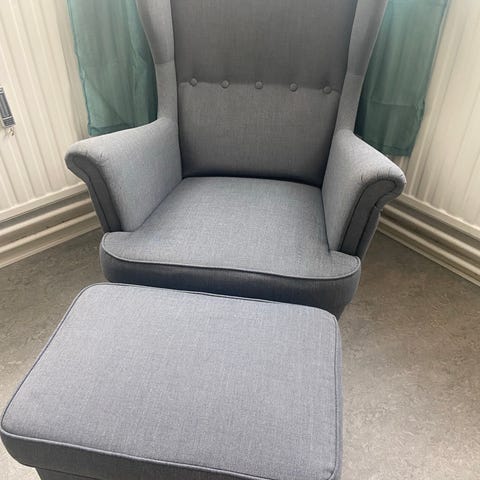Strandmon fåtölj från IKEA med tillhörande fotpall