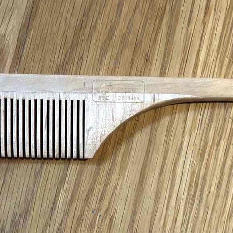 Handgjord kam i trä. Reder ut håret utan att skada det. Kammen är tillverkad av två delar trä som är ihopsatta (med ultraljud, helt utan lim) med ådringen åt olika håll. Tack vare detta går kammen bra att använda även i vått hår utan att man förstör kammen. Kammen är anti-statisk, handtillverkad och behandlad med linfröolja och karnaubavax.