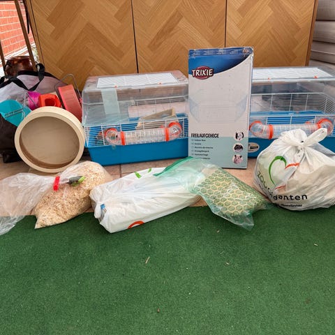 Hamsterhjul, mat/vatten-skålar, hage, hus, kryptunnlar och flexibla byggdelar säljes.