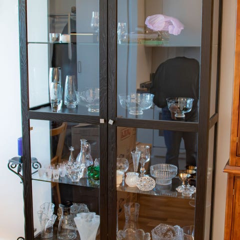 Säljer ett fint vitrinskåp med sirlig utformning.