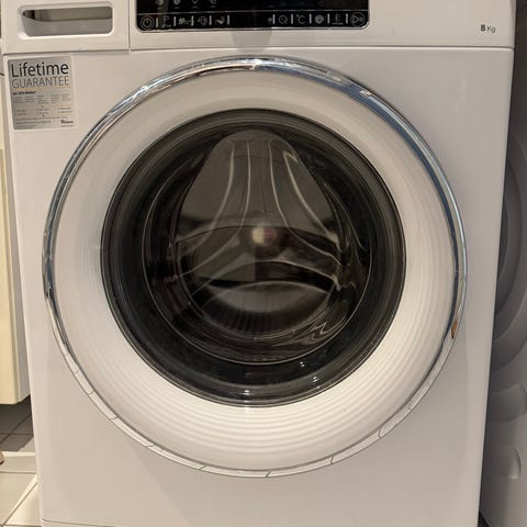 Samsung frontmatad tvättmaskin i vit färg. Maskinen har frontlucka med glasfönster och digital display med vred- och knappreglage på framsidan.