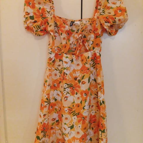 H&M Divided sommarklänning för dam i storlek XS. Klänningen är flerfärgad med blommigt mönster i huvudsak orangea och vita toner. Tillverkad i ett vävt material av 98 % polyester och 2 % elastan, vilket ger lätt stretch och följsam passform.
