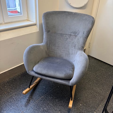 Köpt på Mio.grått tyg. Stolen har helklädd sits och rygg med integrerade armstöd. Underrede med medar i trä och metallstativ ger gungfunktion. Passar som sittplats i vardagsrum, sovrum eller läshörna.