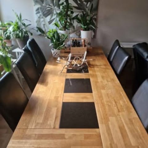 Matbord i massivt trä + 8 stolar (nya sitsar 2025)