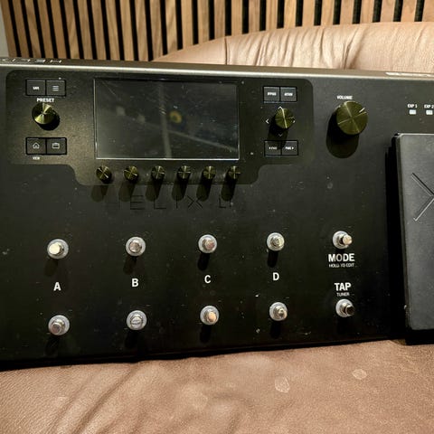 Line 6 POD HD500X gitarrmultieffekt. Den har inbyggd expressionpedal, display och flera fotomkopplare för att byta patchar och effekter. Lämplig för användning i replokal, studio och live-sammanhang där flera effekter och förstärkarmodeller behövs i en och samma enhet.