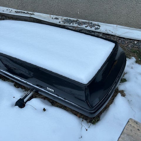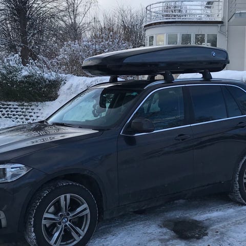 Takbox för SUV i nyskick. Material i glasfiber och högglans lack. Använd tre gånger sommartid på en BMW X5. Med denna på taket behöver man ej bekymra sig att få med allting man tänk på sportlovet. Medföljer bättre byglar än original som skonar takräcket (se bilder).