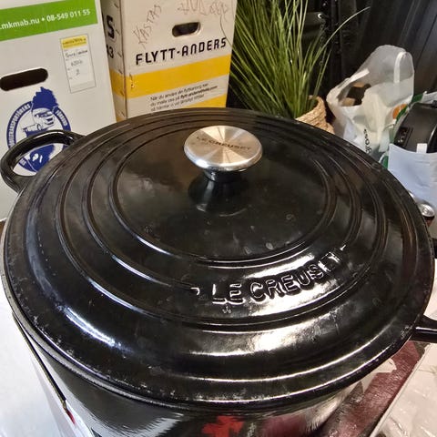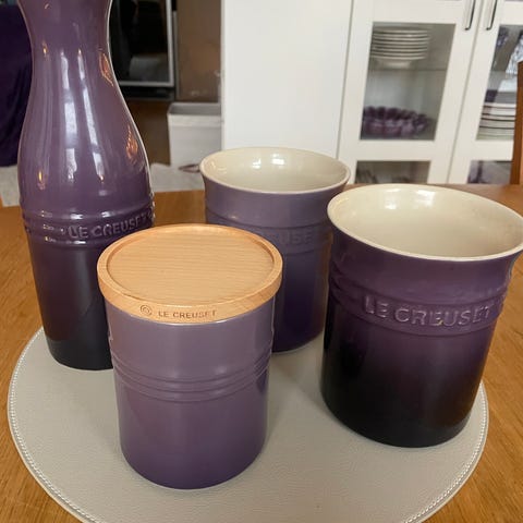 Le Creuset gryta och kökskeramik i turkos färg. Setet omfattar en rund gryta med lock och två handtag, flera små skålar samt två äggkoppar i matchande turkos nyans. Dessutom ingår två kvarnar för salt och peppar i samma färgserie. Insidan på skålarna är ljus, vilket underlättar överblick av innehållet. Produkterna är avsedda för matlagning och servering i kök och matsal.
