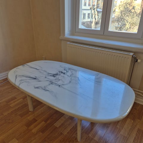 Bordsskivan ligger löst på benen, ganska tungt - så om man inte är stark rekommenderas att man är två som hämtar ☺️ bärhjälp erbjuds inte.