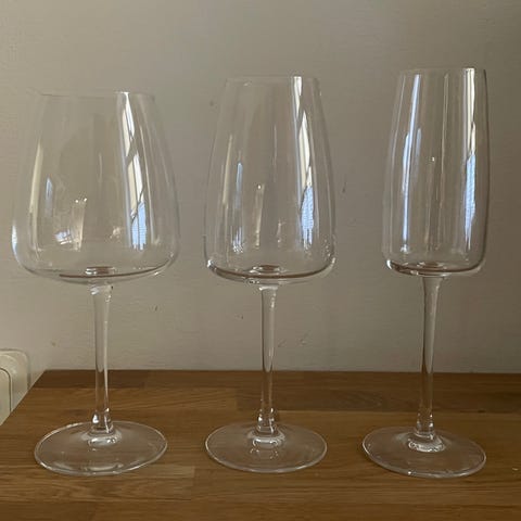 Räfflade glas från Spiegelau LifeStyle, de stora rödvinsglasen samt champagneglasen är ifrån Jotex. Totalt 44 delar.