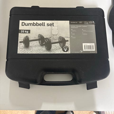 Hantelset med en lång skivstång, två korta hantelstänger och flera lösa viktskivor i metall. Viktskivorna är runda, svarta och finns i olika storlekar för att kunna justera belastningen. Skivstång och hantelstänger har greppvänlig yta och fästen för att hålla viktskivorna på plats. Passar för styrketräning i hemmet, till exempel bänkpress, marklyft, rodd, bicepscurl och axelövningar.