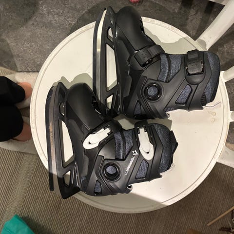 Skridskor storlek 45. Ganska små i storleken men breda med plats för varm socka. Modellen har svart yttermaterial med röda detaljer och röd vadderad insida, skön passform. Snörning, kardborreband och spänne för stabil passform. Passar för skridskosporter eller allmän åkning på is. Inköpta för två år sedan på sportkedjan Decathlon, använda en gång , sedan var det töväder och så småningom för små :) Inköpspris 900 sek och jag säljer dem för 300 sek.