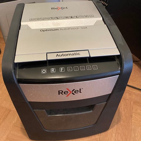 Säljer en rejäl dokumentförstörare av modell Rexel Auto+ 600X Cross Cut. Detta är en högpresterande maskin för kontor som behöver hantera större mängder papper med hög säkerhet. Perfekt för företag som hanterar känsliga personuppgifter (GDPR).