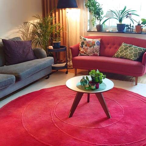 Matta och fåtölj i rött tyg med rundad sits och ryggstöd. Stolen har snurrfot i metall med fyra ben. Passar som sittplats i vardagsrum, sovrum eller kontor.