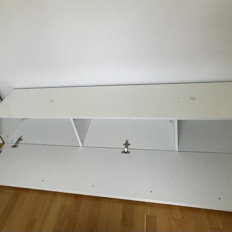 Har varit monterade och målade men luckorna skulle behöva målas om för att få det riktigt snyggt. En del skruvmärken finns från att de varit ihopskruvade med varandra men borde täckas om de sätts tillsammans igen, se bilder.