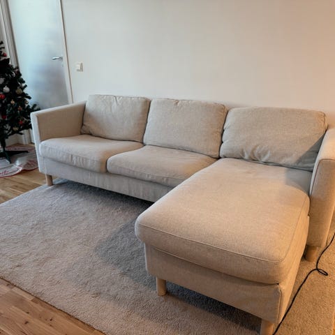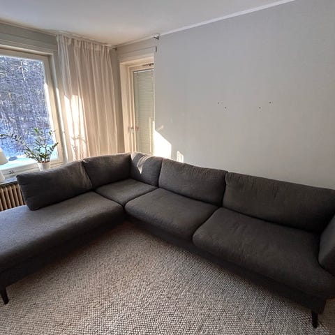 Grå soffa med divan säljes bortskänkes. Väldigt bekväm! Bra höjd på benen så att man lätt kommer åt att dammauga under den. Divanen går att skjuta ut för att justera sittposition.