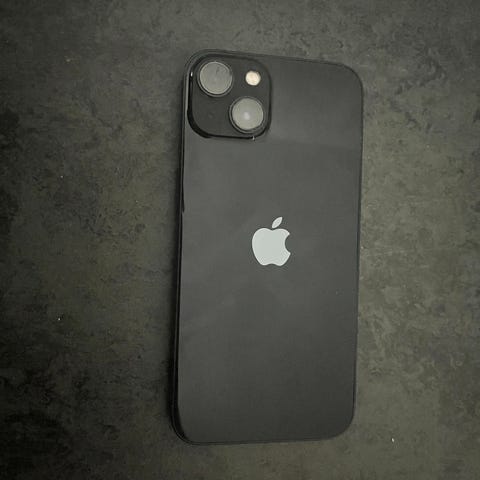Apple iPhone 13 mobiltelefon med 128 GB lagringsutrymme. Modellen har dubbla bakre kameror, pekskärm över hela framsidan och Lightning‑anslutning. Fungerar jättebra..