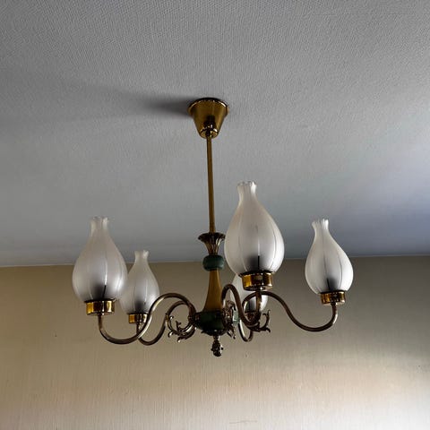 Vacker malmkrona i mässing. Höjd 100 cm inkl kedja går att korta ner enkelt, diameter på kronan 60cm. 8 elektriska ljushållare. Modern el