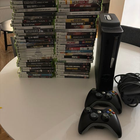Konsol (Trinity), 500GB hårddisk, handkontroll, strömadapter samt ett originalspel ingår.