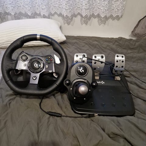 Thrustmaster racerratt med pedaler i svart och röd färg. Ratten har inbyggda knappar och är kabelansluten. Pedalenheten har två pedaler för gas och broms. Passar för bil- och racingspel, kompatibilitet beror på modell och spelkonsol/dator som köparen använder en sladd är sönder men den funkar ändå